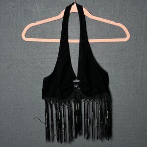 Add a bold, carefree vibe to your wardrobe with this Windsor Black Fringe Halter Top in size Small. Perfect for festivals, concerts, parties, or boho-chic looks, this piece features dramatic beaded fringe detail, a halter neckline, and cropped fit that makes it a true statement piece.