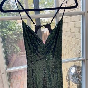 Stunning green sequin maxi dress. Features a fitted silhouette. Spaghetti straps and a deep V-neckline. Perfect for prom, evening events, or bridesmaids dress.