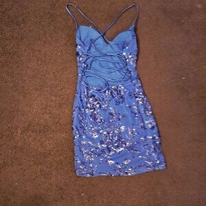 Size M light blue/ purple with silver sequins. Short homecoming dress. Straps criss cross in the back and can be adjusted for perfect fit. Worn once for approx. 2 hours- like new.