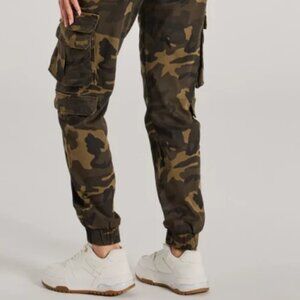 These high-waist women's pants feature cargo pockets accented with metal ring trims and a straight-leg silhouette designed with an elastic hem for a sporty-inspired look. Create a casually chic 'fit with a sleek crop top or get a little dressy with a lace bustier bodysuit.