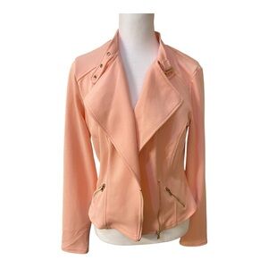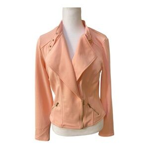 Chic light coral blazer. Features asymmetrical front and zippered pockets. Perfect for any occasion.