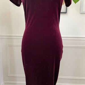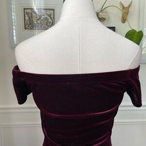Windsor, deep jewel tone, ruby, red burgundy, velvet off shoulder, body con pencil dress. DETAILS
