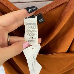 Windsor M Copper Silky Satin Faux Wrap Asymmetrical Spaghetti Strap Mini Dress