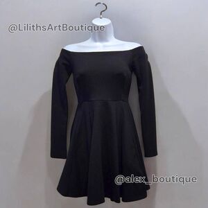 ☆Off the shoulder straight neck, long sleeve padded chest high waist seam a-line skater mini dress.