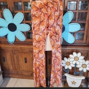 Embrace a vintage vibe with these Windsor orange butterfly flare cut pants, featuring a dramatic flare and a retro-inspired design. The high-waisted fit and stretch fabric ensure comfort and style, making them perfect for any bold fashion statement. The swirling pattern in warm tones adds a touch of 70s flair to your wardrobe.