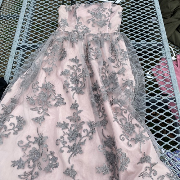 Charming kids dress with pink base and gray floral embroidery. Ideal for formal events.