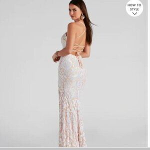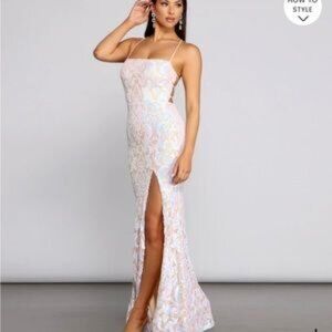 perfect condition, worn once for prom and i loved it! windsor dress with side slit, tie back, iridescent sparkle pattern. has built in bra padding