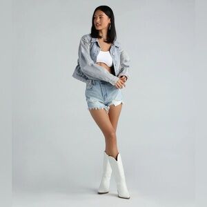 Layer on this rocker-chic denim jacket for a glam festival vibe! It features a collared neckline, long sleeves with buttons to cuff, a complete button-down front, front pockets, rhinestone fringe detailing down the front and back, and a cropped, relaxed fit. The sparkling rhinestone fringe will move with you as you dance to the music. Style with sleek hoop earrings and cowboy boots.