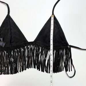 Bring the western vibes to your festival 'fit with this trendy faux suede halter top! It features a sleeveless V-neckline, triangle cups, halter spaghetti straps, a bold open back, a cropped fit with cascading fringe, and mini rhinestone embellishments for a glam sparkle. Style this crop top with a cow print mini skirt and boots!
