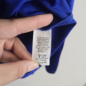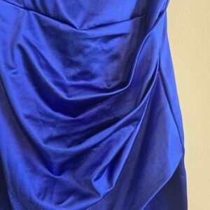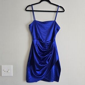 Chic mini dress in royal blue satin. Features a draped front and spaghetti straps. Perfect for a night out.