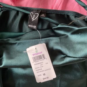Elegant green satin dress with ruffles. Cross cross back detail!