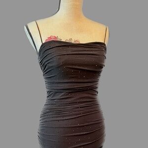 • A sleeveless mini dress is adorned with rhinestone embellishments along a stunning bodycon silhouette with side ruched seams that show off your curves. Perfect for the school dance or a party.