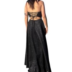 Gorgeous Windsor strapless formal dress in classic black with a subtle sparkle finish — perfect for prom, formal events, or special occasions.