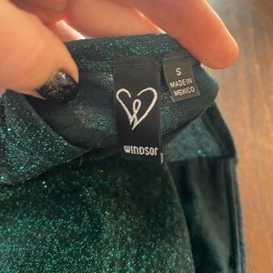 This is a strapless dress from Windsor. It's a beautiful emerald green glitter dress. Excellent condition. Full length. Slit in front. Measures across the chest approx 12 1/2 inches. Top to bottom measures 55 1/4 inches. Measurement from waist to slit is 16 inches. The waist to bottom of dress measures 48 3/4 inches. Waist across measures 12 inches. Dress does have some stretch to be form fitting. Great for prom or home coming dances.