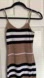 Elegant striped dress featuring tan and black colors. Perfect for any occasion. Straps are adjustable.