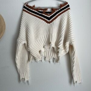 Varsity striped sweater. Tattered V neckline, long oversize dolman sleeves, a cropped hem, and a ribbed and destructed trim. The ivory sweater is composed of a knit fabric and has black and rust hued varsity style stripe details.