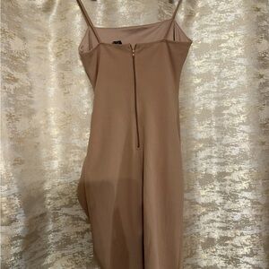 Chic tan mini dress with ruched detailing. Perfect for a night out.