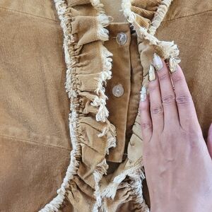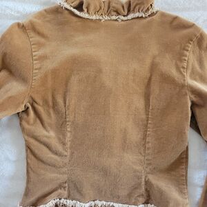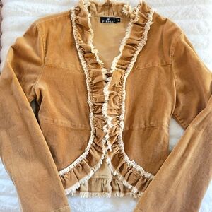 Elevate your style with the Windsor Tan Ruffle Trim Jacket. Perfect for adding a touch of elegance to any outfit.