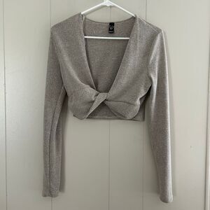 • Top: Deep V neckline, twist front detail, long sleeves, cropped fit