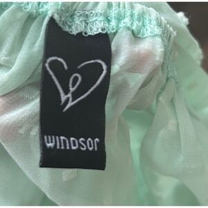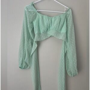 Chic mint green blouse with polka dots. Sheer fabric and tie front design. Perfect for a stylish look.