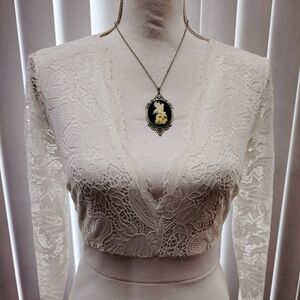Design: Sheer lace upper ✦ Long sleeves ✦ Drop waist ✦ Lined body ✦ Zip-back closure