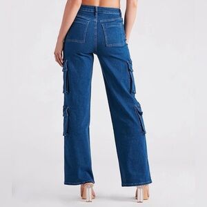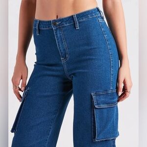 Cute and in charge, that's just how you'll like it in these cargo denim pants essential for looking cool for the summer! It features a high-rise waist, four flap cargo-style pockets, two back pockets, and a wide-leg silhouette on dark-wash denim fabric.