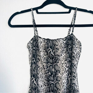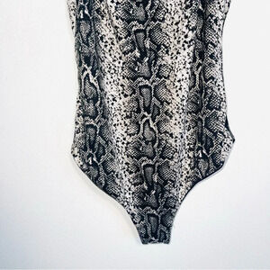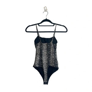 Windsor Wild Child black & tan snakeskin print thong bodysuit. In excellent condition! Square neckline. Spaghetti straps. Thong bottom with snap button closure. Tan & black snakeskin print. Size small.