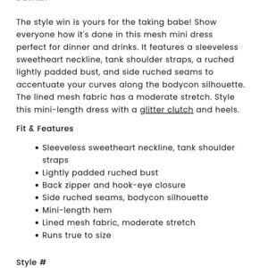 The style win is yours for the taking babe! Show everyone how it's done in this mesh mini dress perfect for dinner and drinks. It features a sleeveless sweetheart neckline, tank shoulder straps, a ruched lightly padded bust, and side ruched seams to accentuate your curves along the bodycon silhouette. The lined mesh fabric has a moderate stretch. Style this mini-length dress with a glitter clutch and heels.