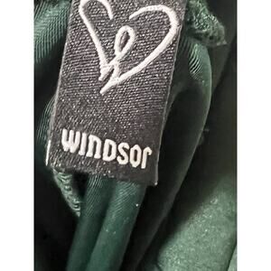 Stunning Windsor Women’s Green Velvet Maxi Dress in Size Medium, featuring a plunging neckline, criss-cross open back, and elegant side slit. Beautiful soft polyester/spandex velvet with a flattering silhouette. Pit to pit: 14”. Pre-owned in good condition with a small spot under the inner panel (shown in photos) — not visible when worn. Perfect for formals, holiday events, prom, or evening occasions.