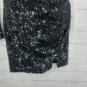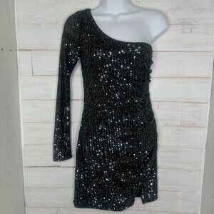 Windsor Womens Dazzling Diva Black Sequin One Shoulder Mini Dress - Size Small EUC (no signs of wear, no flaws, stains, rips or tears) One shoulder neckline with a single long fitted sleeve Front tulip hem with ruched detailing Short curve hugging silhouette Back zipper and hook and eye closure Short form and hugging fit moderate stretch 100% polyester Style Tags: Date Night Club Party Cocktail See Pictures for Measurements **Smoke free home** All orders ship next business day! Please let me know if you need additional pictures or have any questions!!