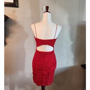 Sleeveless square neckline. Bungee spaghetti straps. lower back keyhole. Mini Length. Lined mesh fabric. Form hugging fit. There is no size tag, appears to be a small. Look at all measurements. One faint mark on back, see photo. In good preowned condition. Smoke Free Home