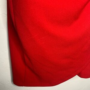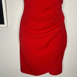 This is a red mini square neckline bodycon dress with a ruched wrap front detail. It’s a size medium in good pre owned condition. It has a small stain on the front (See Photos For Details).