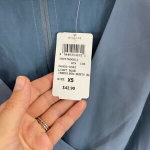 NWT Windsor XS Dusty Light Blue Ruffle Wrap Vneck Tie Front Romper Flirty Vibes Ruffle Detail Romper Short flutter sleeves V-neckline, wrap-front design Back zipper and hook and eye closure Tie-front belt with tassel details Faux wrap-front covering fitted shorts Ruffle accents Woven fabric with a lining and no stretch