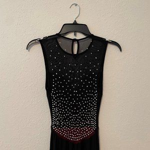 Smooth and sultry, this formal gown from Windsor flows framing your beautiful back and a lovely length of leg along the way. Dipped back with mesh and beautiful detail with rhinestone at front and back. Size: 1/2 Color: Black. Sleeveless. Thigh-high front slit and lined on red color. 95% polyester 5% spandex. A beautiful, form-fitting dress for formal occasions. Worn only once for a wedding. Dried cleaned and ready to go. Will ship same or next day.