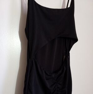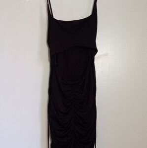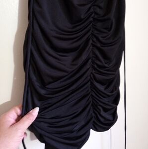 Windsor black slinky stretchy ruched bodycon mini dress with cut out, fabric tie and adjustable spaghetti straps. Great pre-owned condition with no flaws noted.