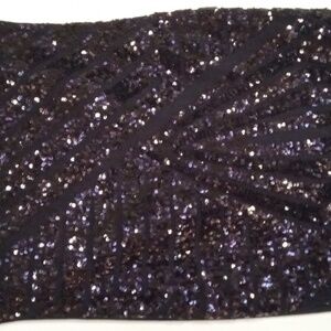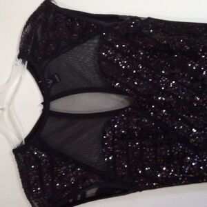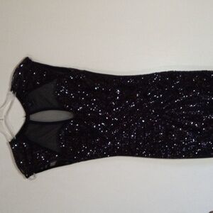 Black sequined bodycon midi dress by Windsor with illusion sweetheart neckline. Buttons in back with keyhole and half zip entry. Size xsmall and has stretch. Back is a cotton poly fiber mix. Great pre-owned condition with no flaws noted.