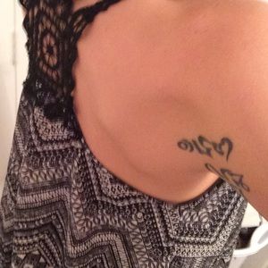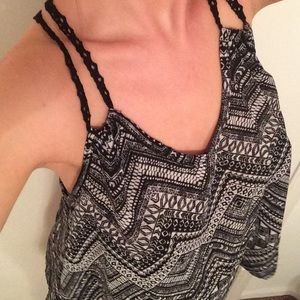 Lacey flowy black and white V Cut tank top. Razor back crotchet design back