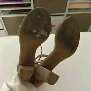 These are good used condition with minor marks on the sole of the shoe. These have an ankle strap and zip closed in the back. They are a block heel.