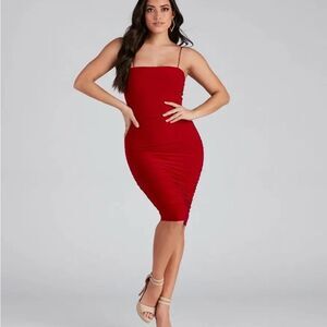 This vibrant red mini dress from Windsor features a ruched design that adds texture and style. With its sleeveless spaghetti straps and square neckline, it's perfect for a cocktail night out. The bodycon fit ensures a flattering silhouette, making it a standout choice for any special occasion.