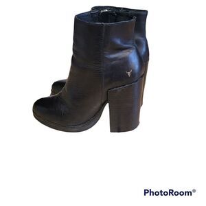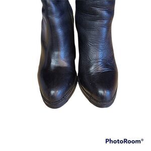 Black leather booties with a 4" heel and a 1" platform. Has silver side zipper. In great pre-owned condition. Has some creasing in the leather but that is usual. Size 7.