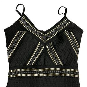 This dress is so flattering. Fitted with an elastic hemline and throughout the dress design with adjustable straps. Gold embellishments with smaller silver/black provide elegant and flashy accents. Size tag is missing, but fits my medium mannequin perfectly.