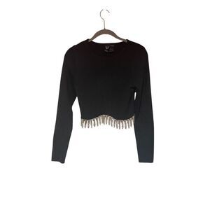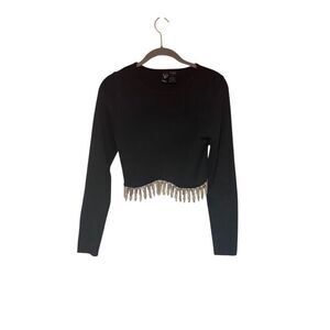 Windsor women’s bejeweled me rhinestone cropped long sleeve knit, black fringe sweater stretch pit to pit 14 inches length 15 inches