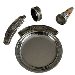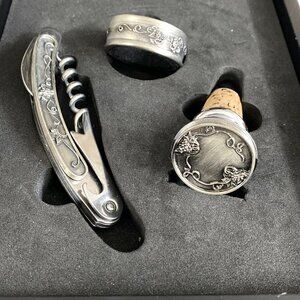 Wine Bar Set in Wood Box Grape Vine Pattern Tray, Corkscrew, Stopper & Neck Ring