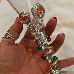 Beautiful clear glass with a heavy silver toned wire wrapped with jewels