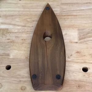 Wine Bottle Display Holder, Bar Accessory, Wood and Agate. Boat shaped polished wood has a hole into which the wine bottle is inserted to hold it with the cork wet. When you remove the wine to serve it, the blue agate acts as a coaster. Please note, the agate has a tiny crack in it. This is a new item. 13” long and 4.5” wide and 0.75” deep.