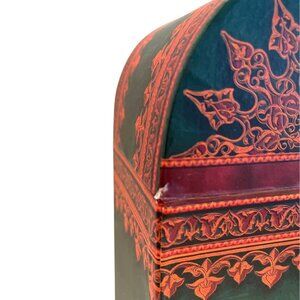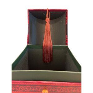 This wine gift box features an intricate floral design in rich green and red tones. The attached tassel adds a touch of elegance, suitable for formal occasions.