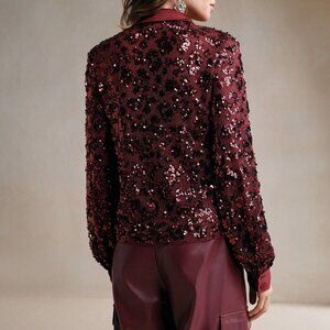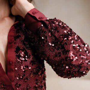 Elevate everyday outfits with this burgundy blouse, showcasing shimmering sequin detailing, a classic collar and long sleeves for a polished regular fit. The regular length and casual style make it easy to pair with jeans, skirts or tailored pants, while the subtle sparkle adds a sexy edge for both day and night looks. Designed with a breathable mesh overlay, the piece balances comfort and shine, ideal for brunches, office casual, or evening events.