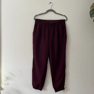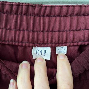 Poly Crepe wine colored pants from Gap. Elastic gathered waistband and cuffs with faux-fly at front. Side-seam pockets. Sort of "jogger" style - These are very comfy but have a slightly elevated look due to the crepe material. Size Medium Petite. Very gently worn, like-new condition.
