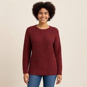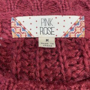 Stay warm and stylish with this pre-owned Pink Rose chunky knit sweater in a rich wine/burgundy hue. The thick textured weave and flattering silhouette make it a perfect staple for fall and winter layering. Designed for comfort without sacrificing style, this sweater brings a cozy, minimalist vibe to any outfit.