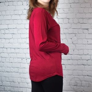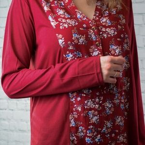 Long sleeve, floral print Henley in wine red. Floral print front panel and collar with solid wine sleeves and black. Functional front buttons and longer, curved hemline.